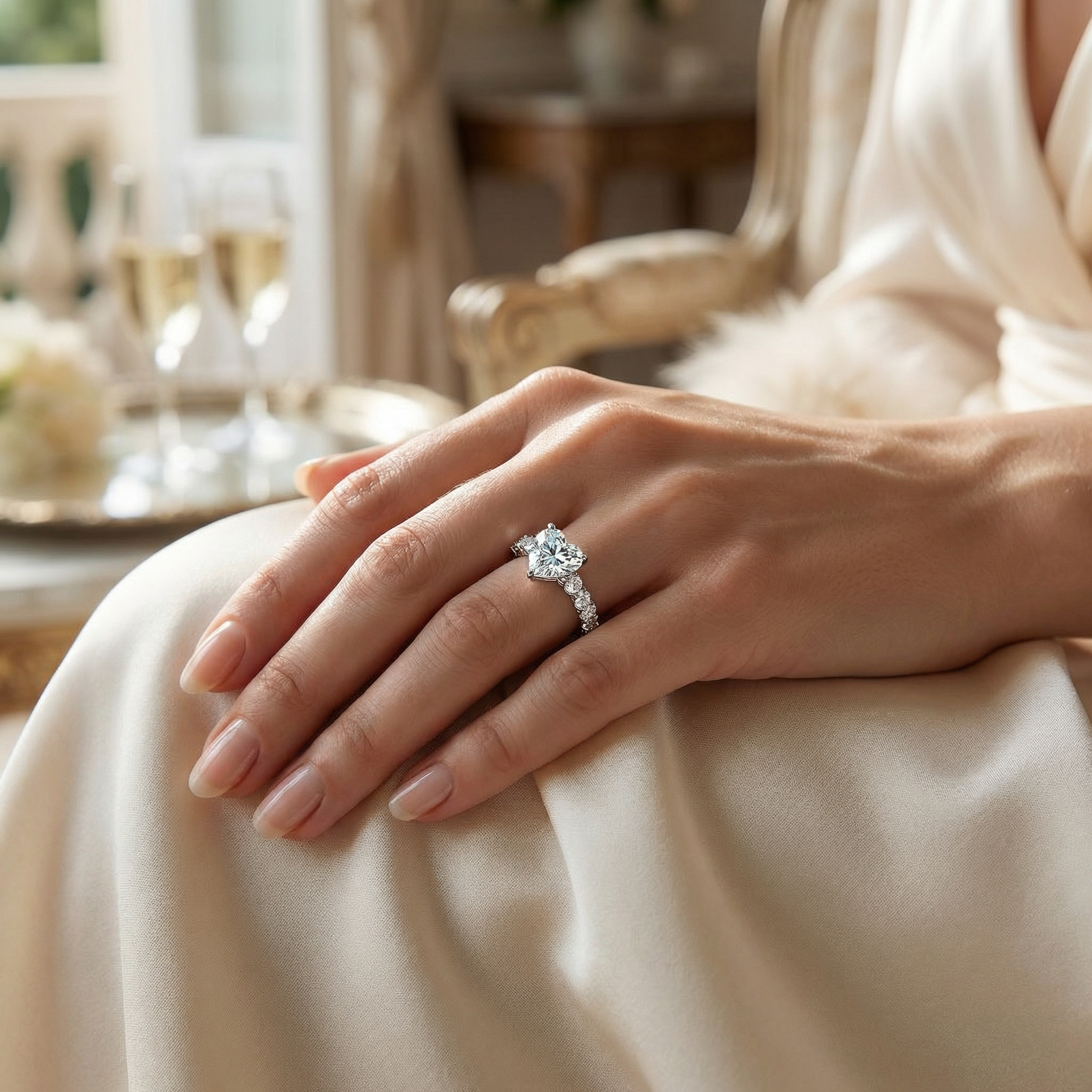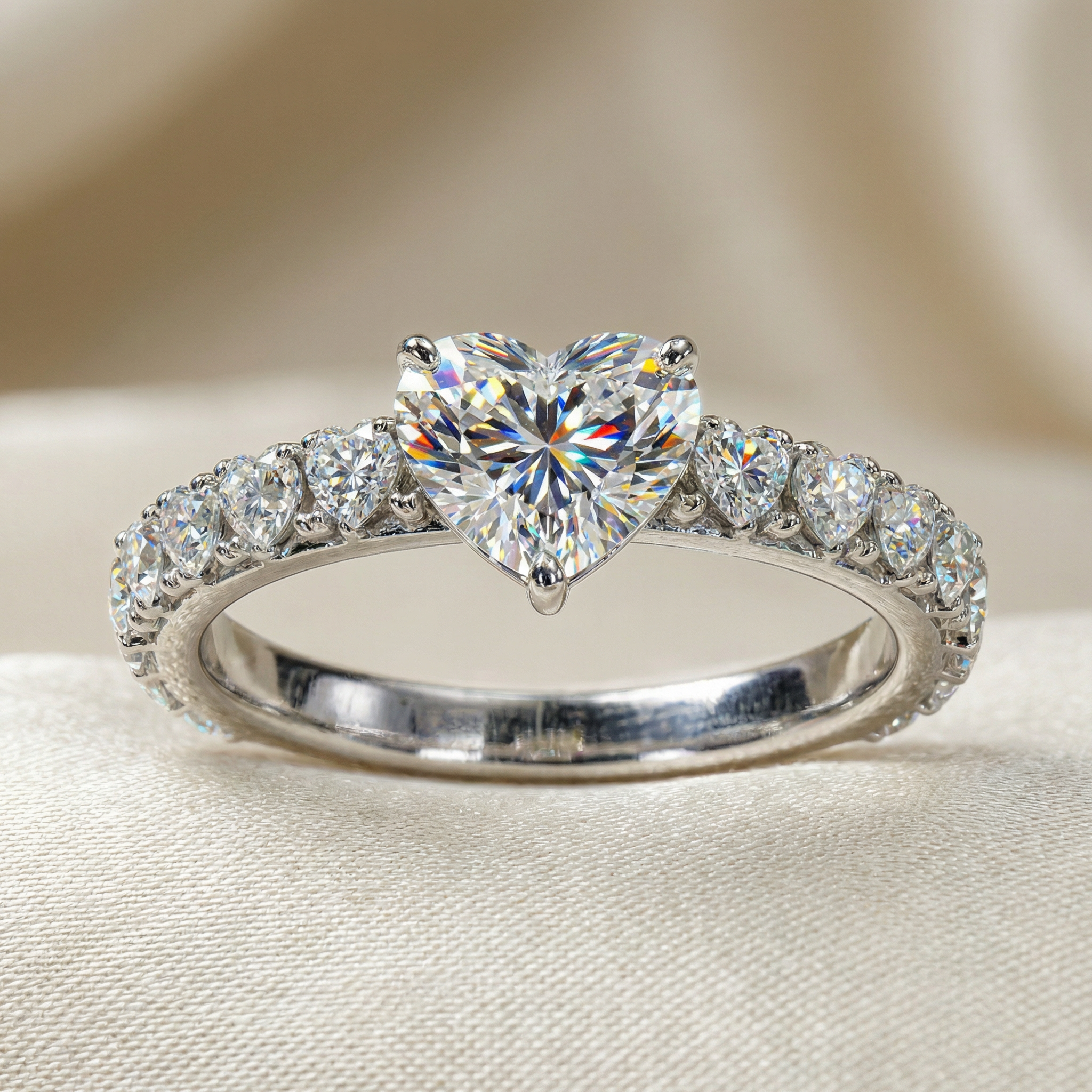 The center stone is complemented by delicate side diamonds along the band, introducing a subtle extension of brilliance while preserving the visual dominance of the heart-shaped diamond. The composition maintains harmony between the expressive center stone and the structured brilliance of the accents.