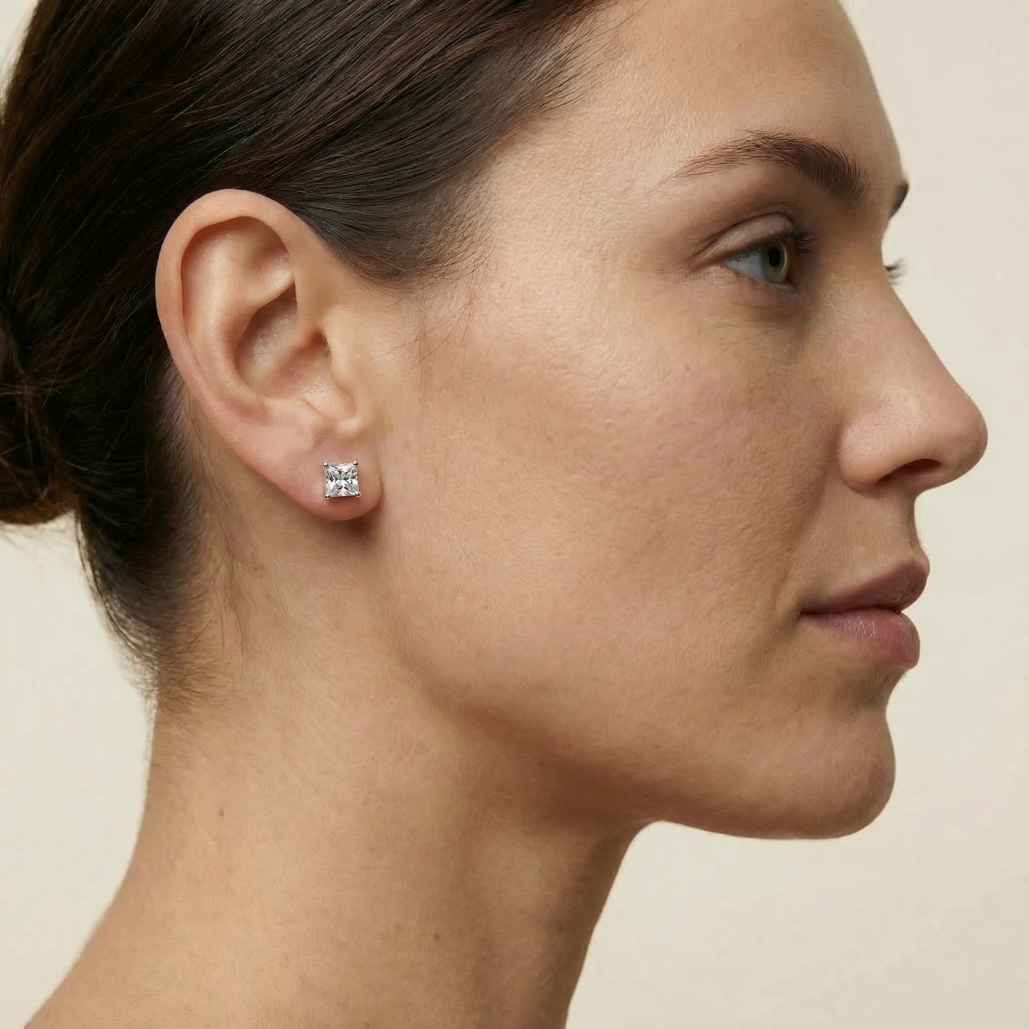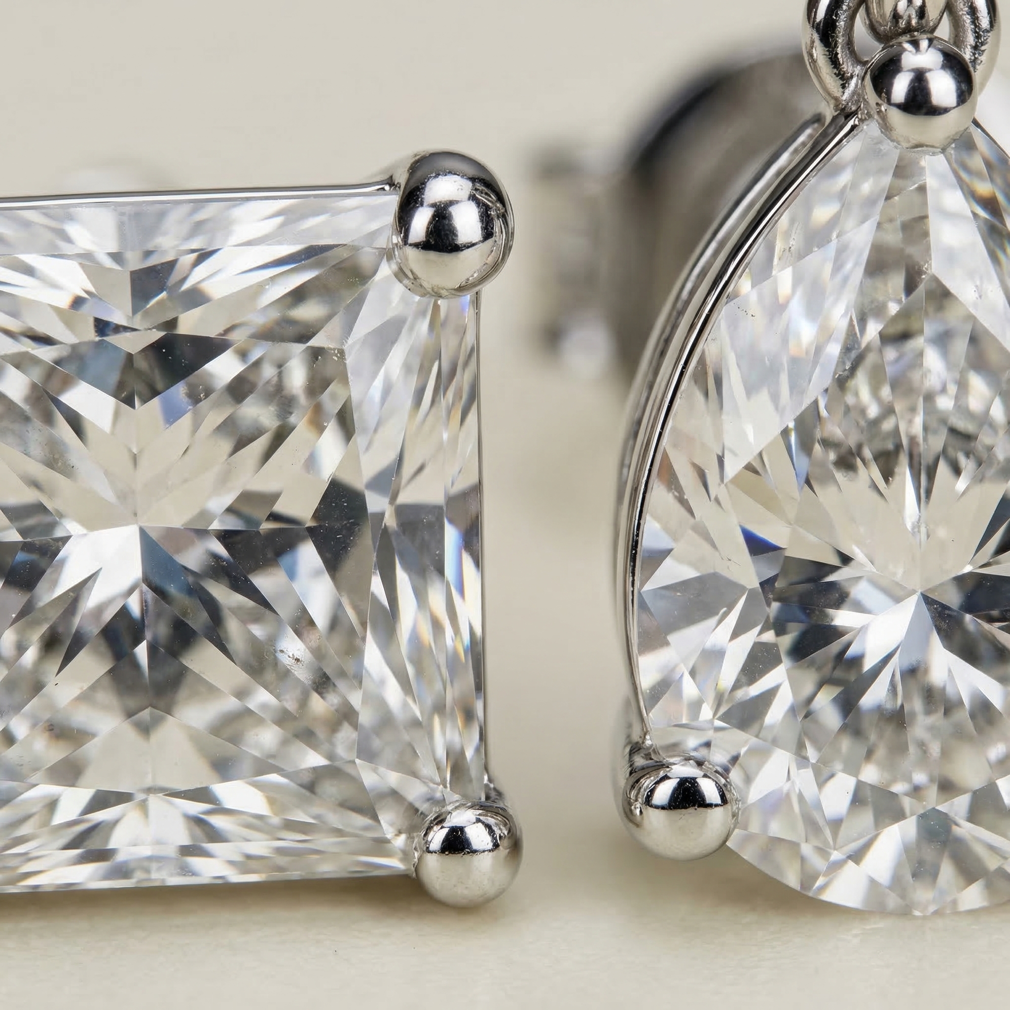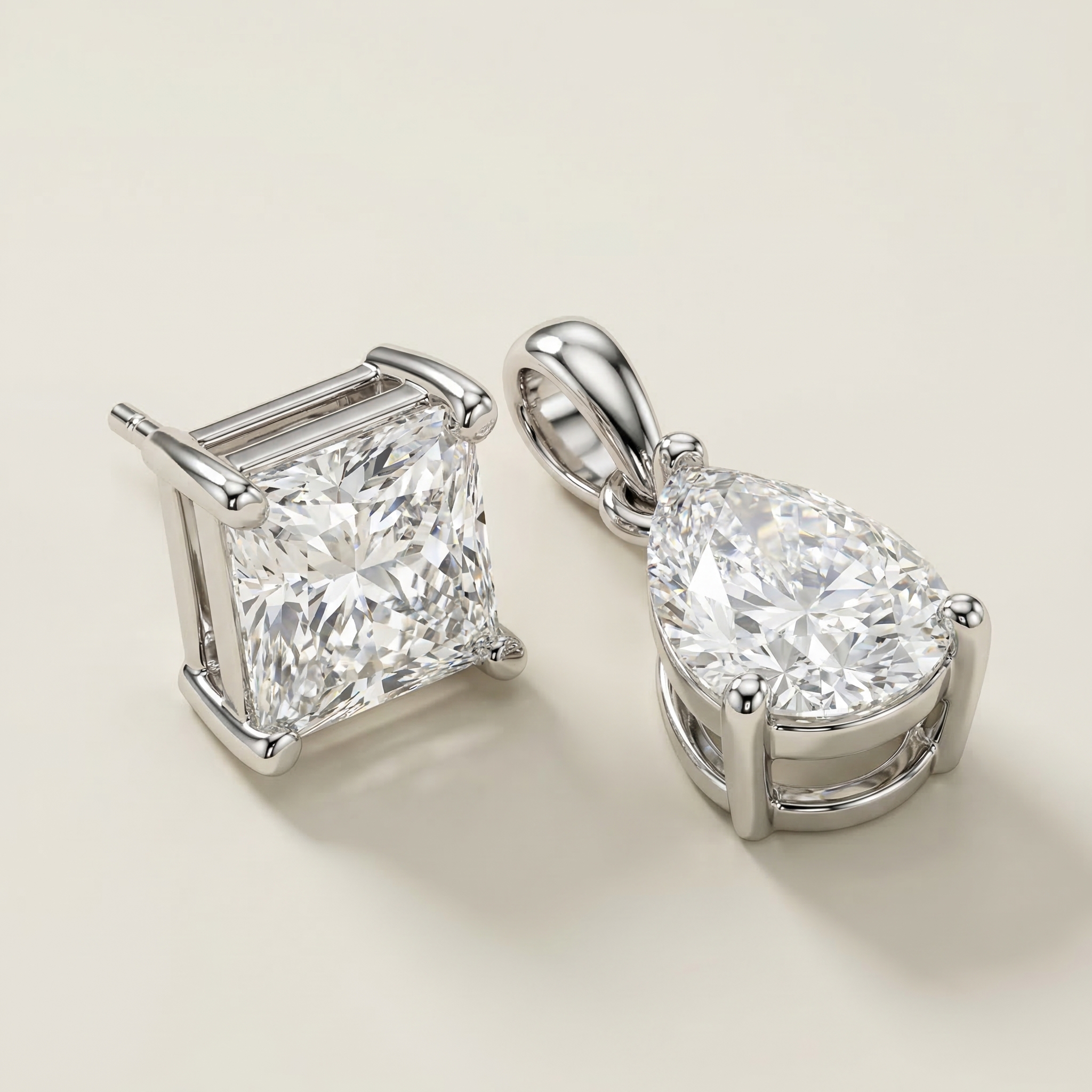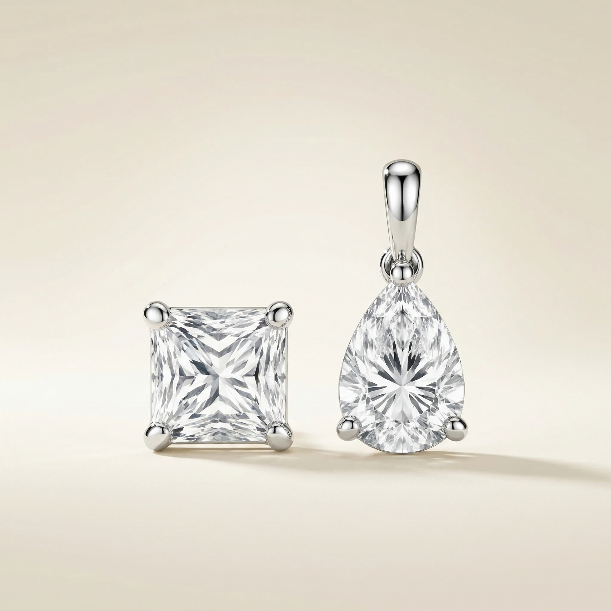 A modern and expressive composition, the Earrings 2 Shapes — Aesthetic combine two distinct diamond silhouettes in a refined and balanced design. The pairing of an Asscher-cut diamond with a pear-shaped diamond creates a dynamic contrast between geometric precision and fluid elegance.