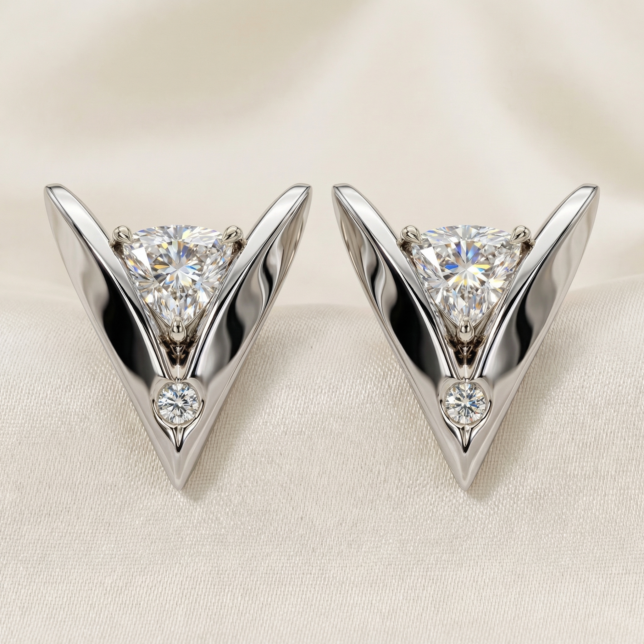 Each earring features a single triangular diamond, allowing the purity of the stone’s form and brilliance to remain the focal point. The minimalist setting enhances light performance while maintaining a disciplined and elegant silhouette.