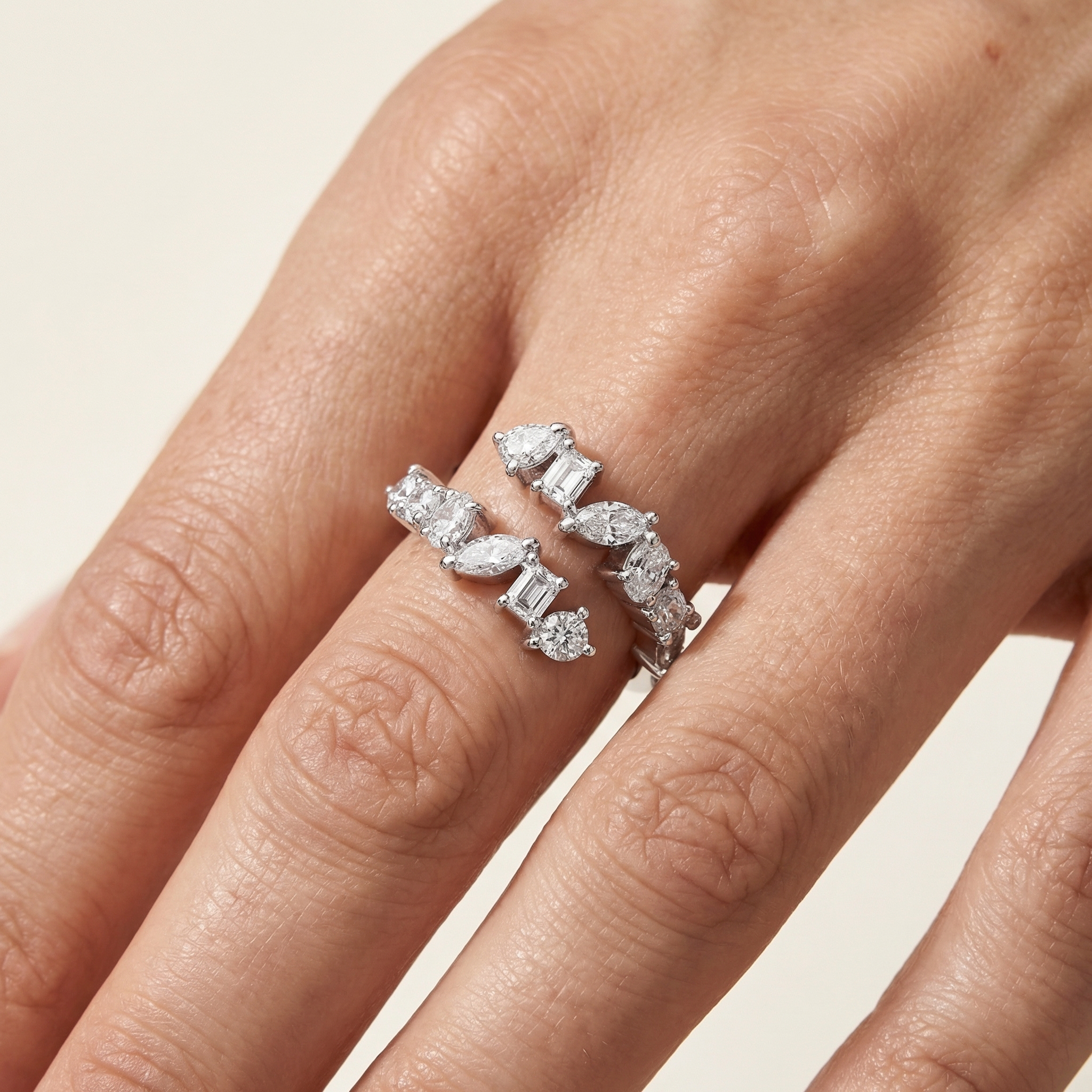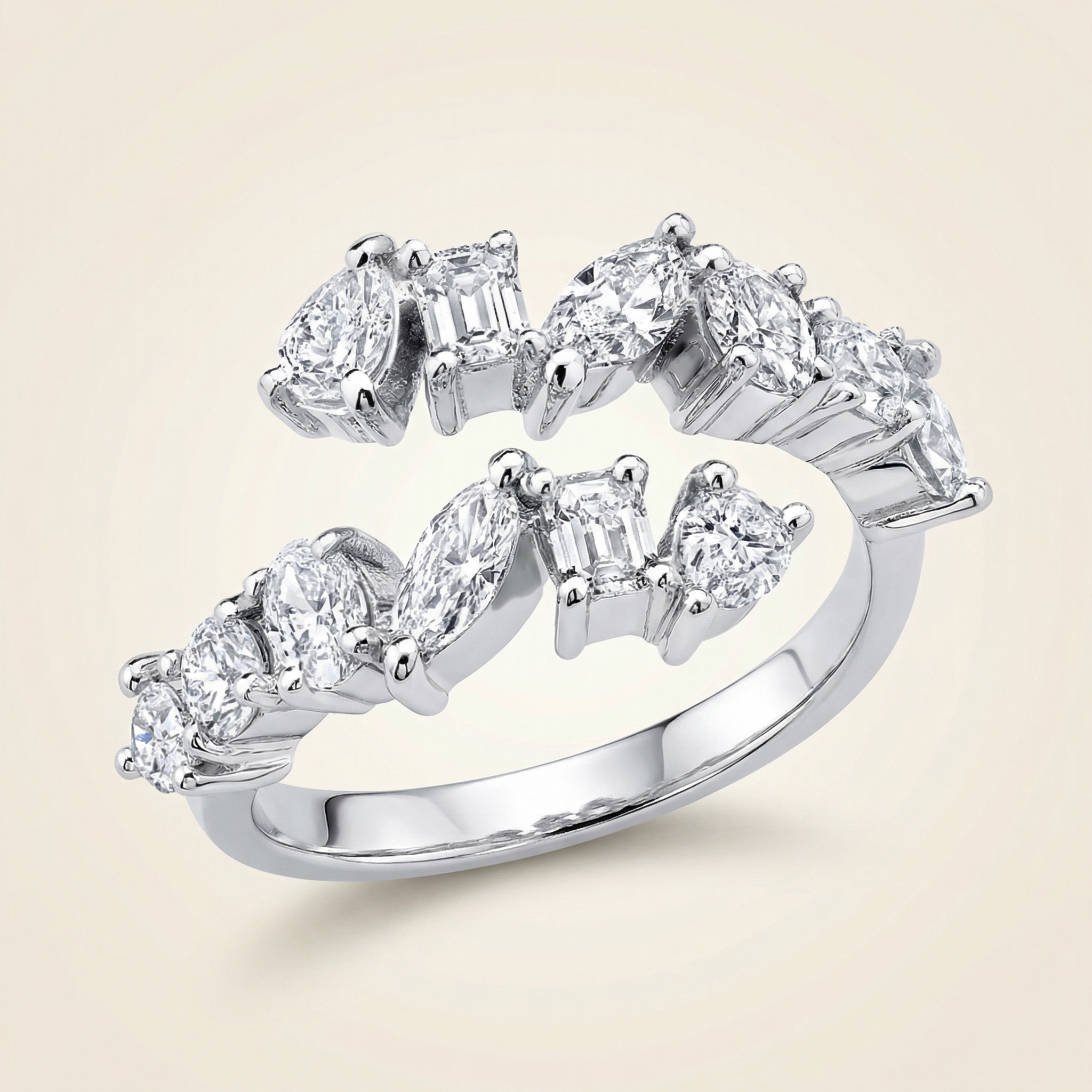 Each diamond is carefully positioned to maintain proportion and flow, allowing the interplay of shapes to form a modern yet disciplined silhouette. The result is a ring that feels expressive without excess — structured, elegant, and timeless.