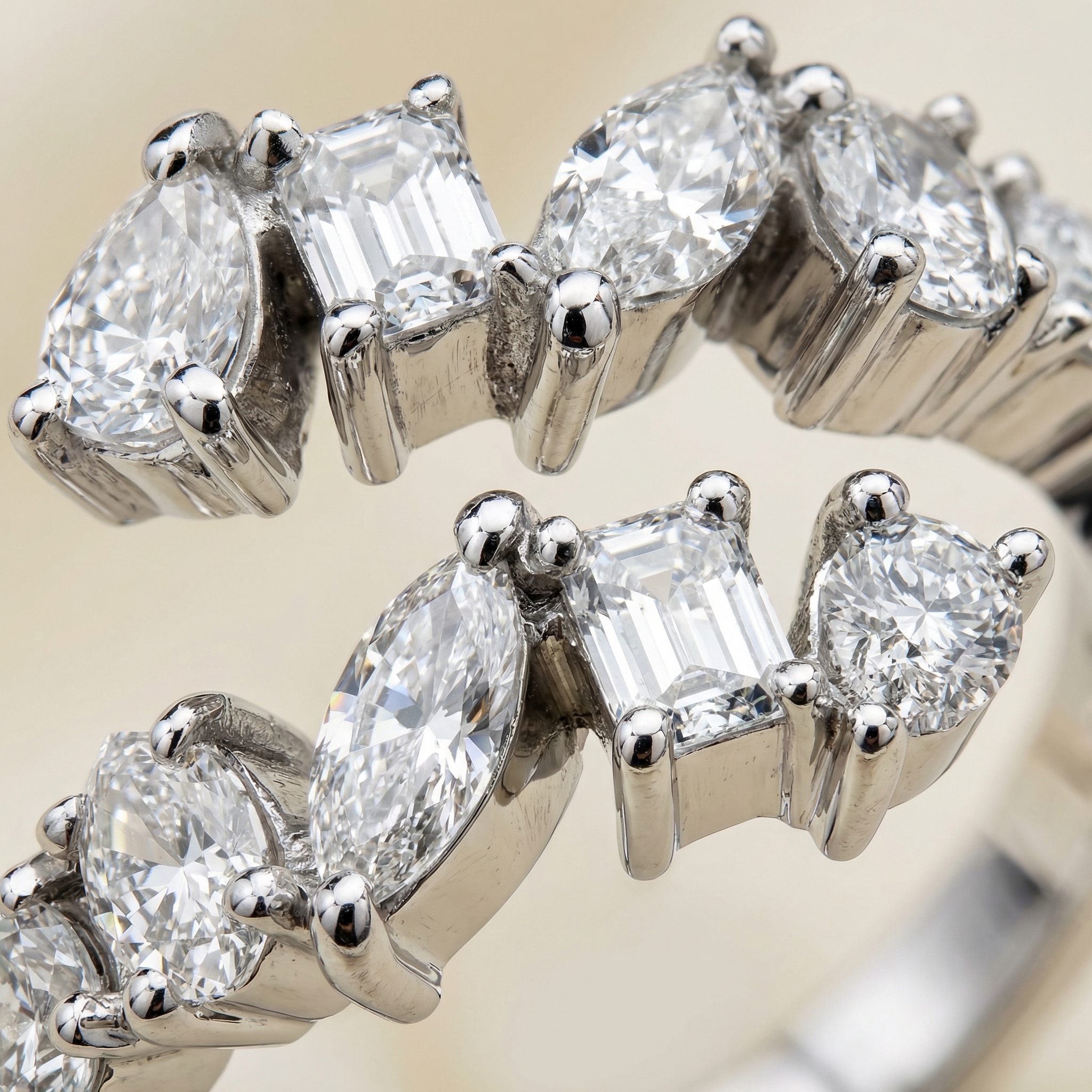 A contemporary interpretation of the eternity concept, the Eternity Modern Ring — Aesthetic is defined by a refined composition of multi-shaped diamonds arranged in a continuous and balanced design around the band. The variation of shapes creates a dynamic rhythm of light, adding depth and visual interest while preserving overall harmony.