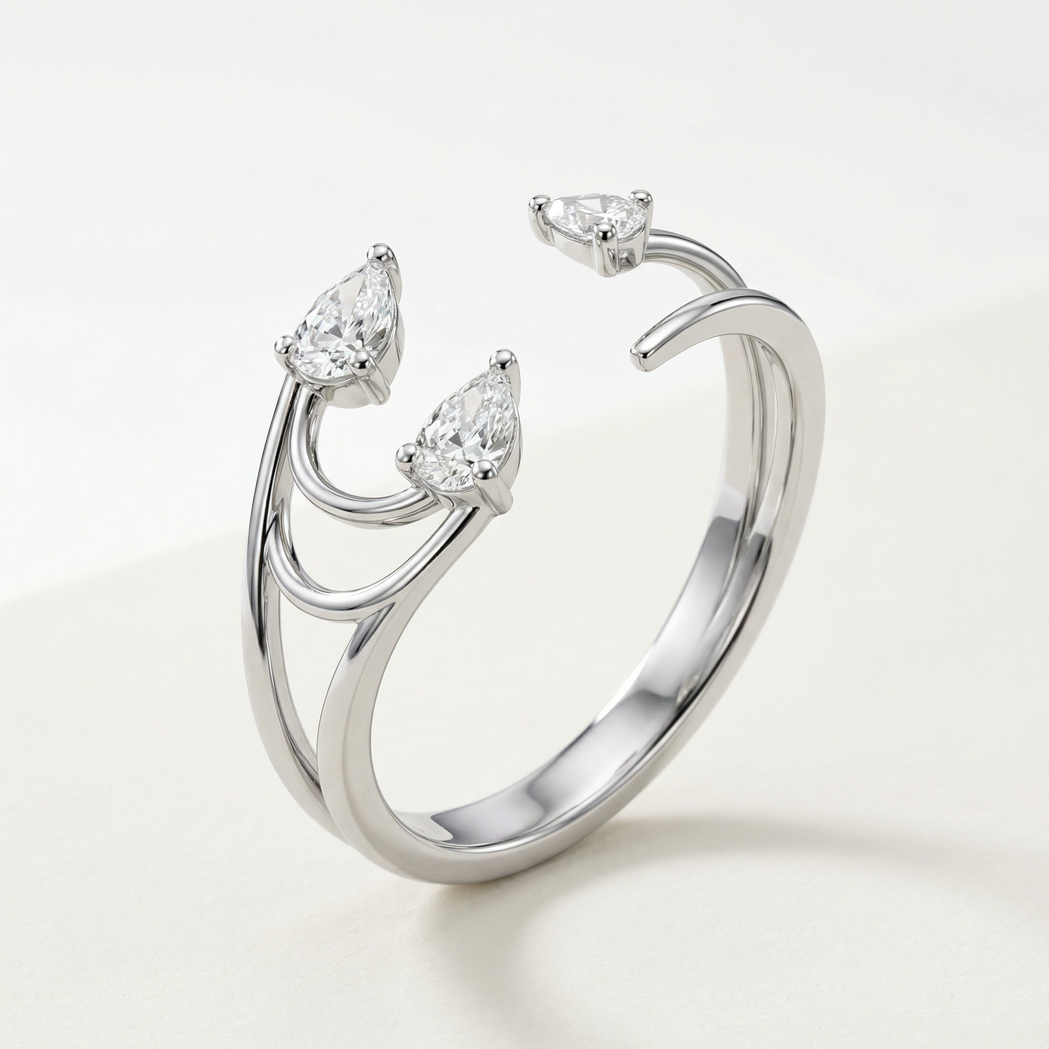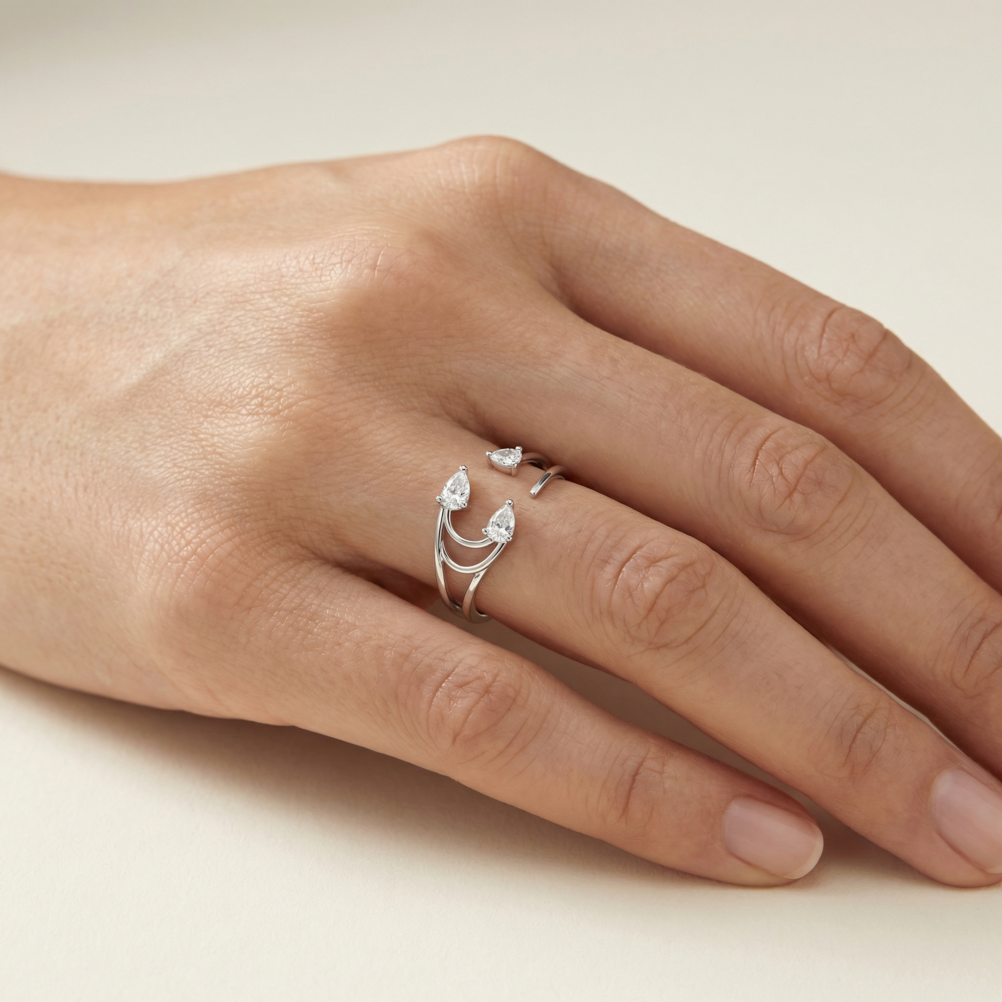 The Open Ring Pear is crafted in 18K white gold, featuring a refined open silhouette with three pear-cut laboratory-grown diamonds arranged in a balanced, sculptural composition. The flowing double-band structure enhances movement and light while preserving architectural clarity.