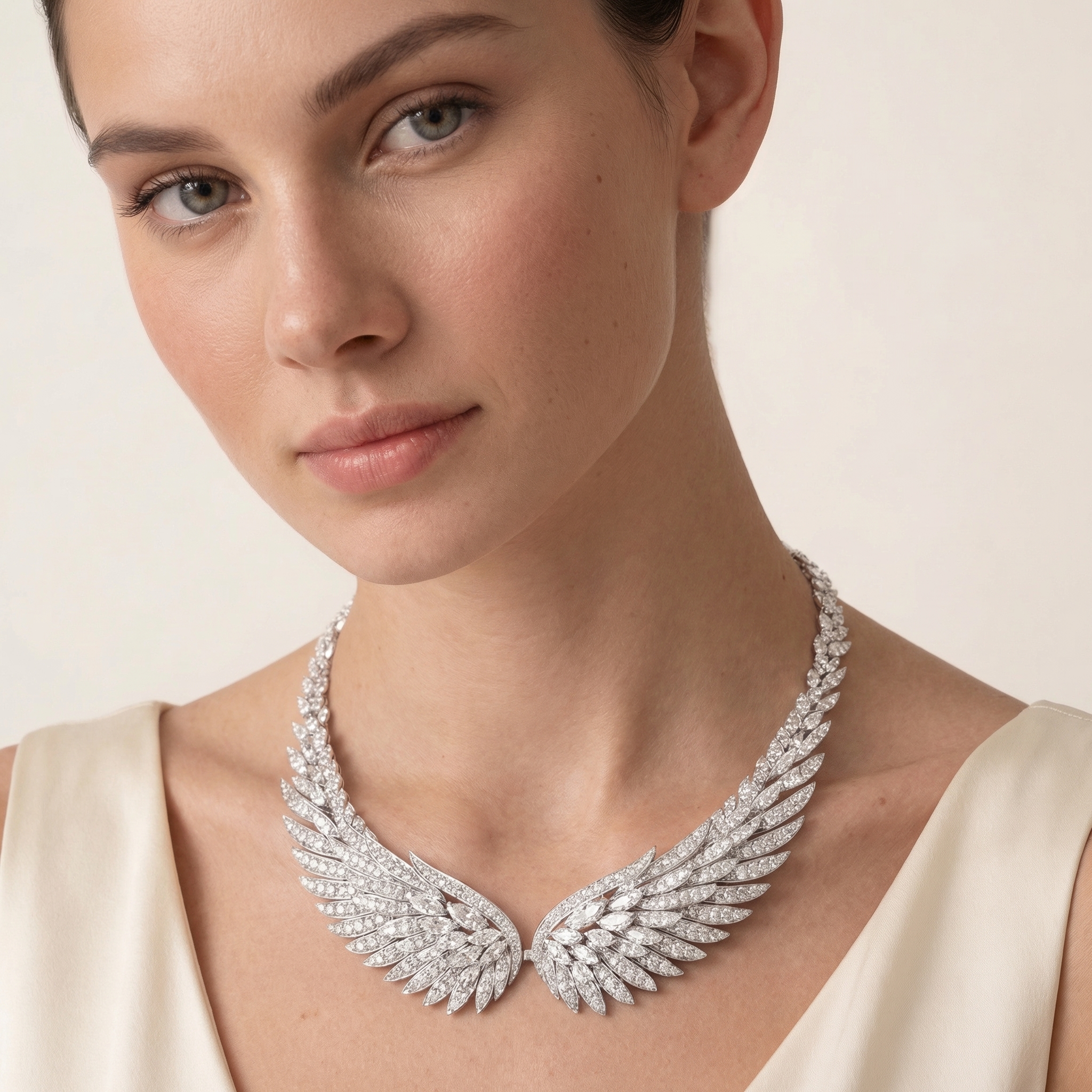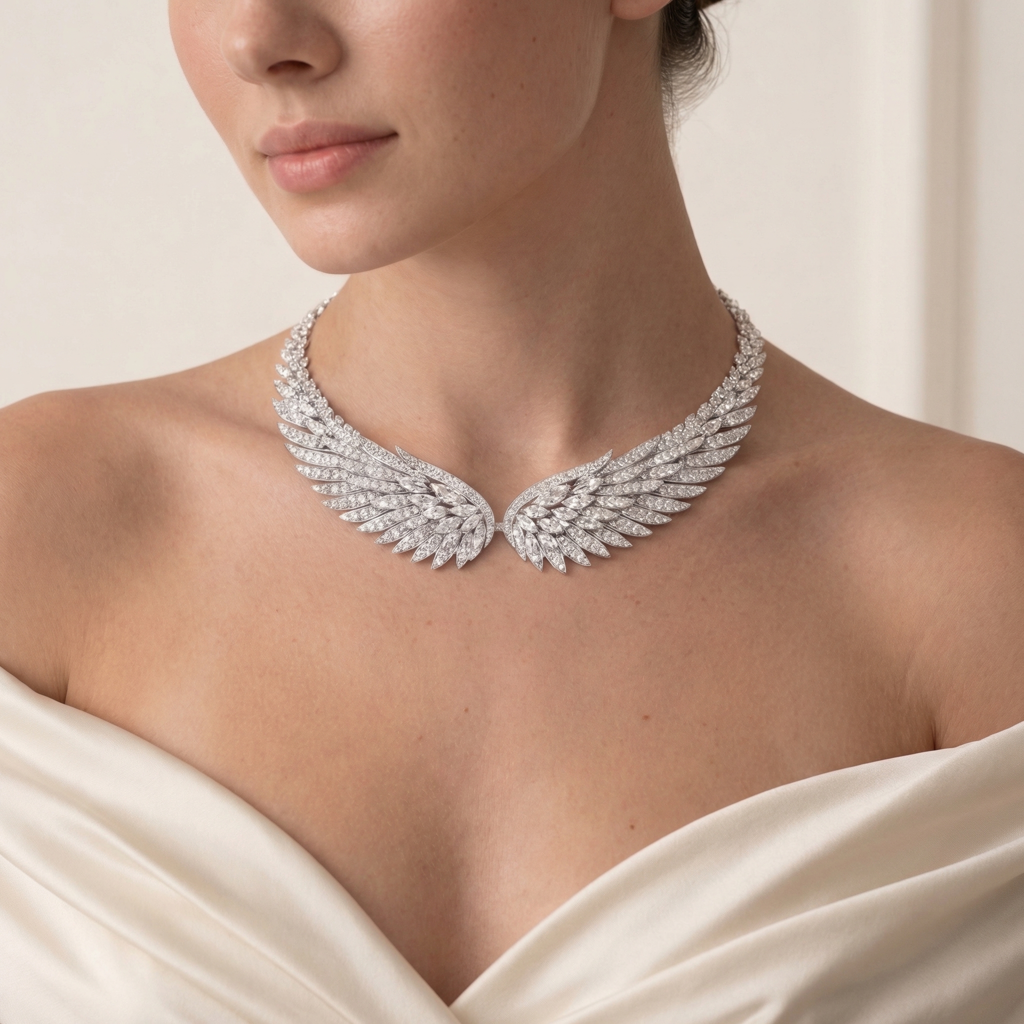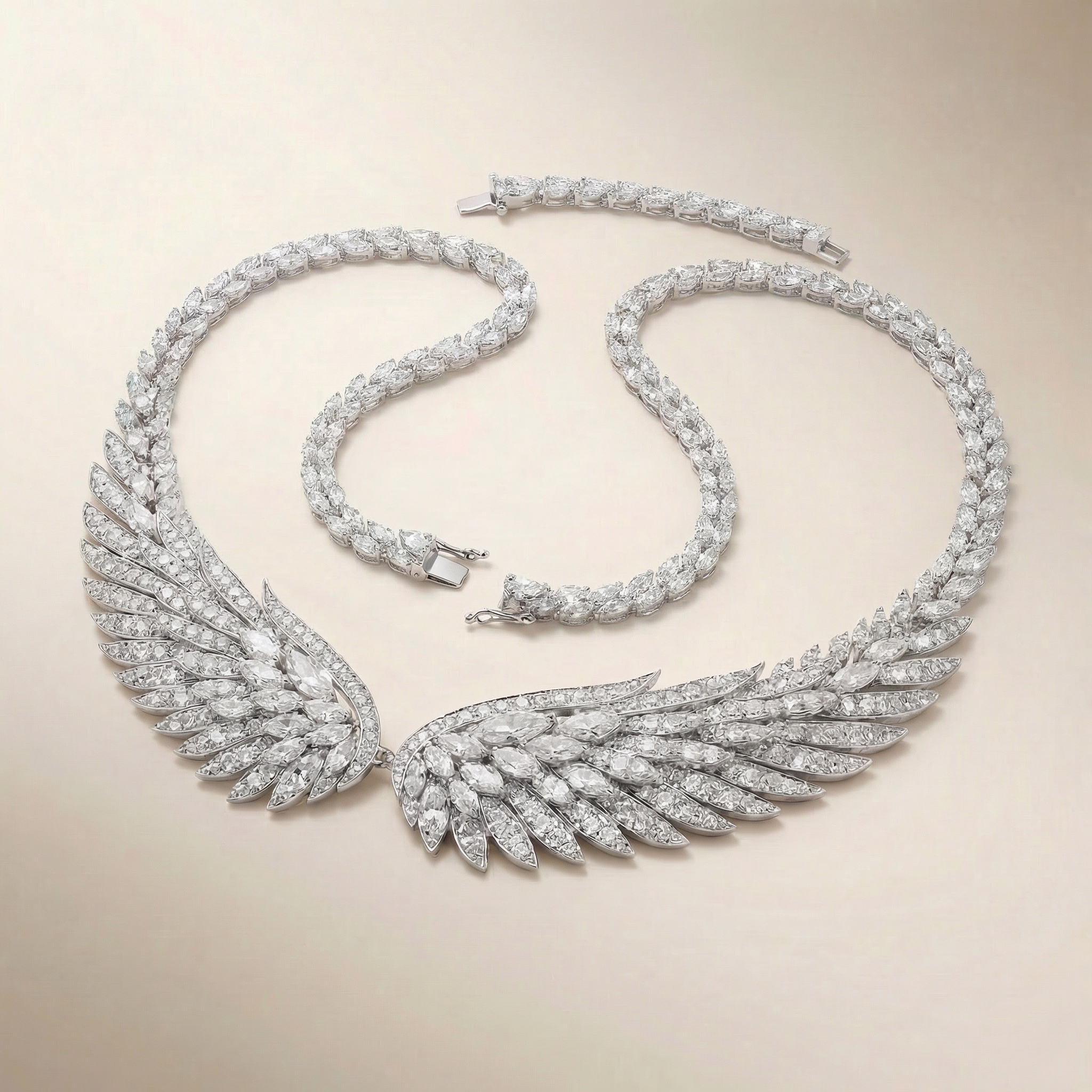 A refined expression of movement and structure, the Swallow Wings Collair — Invest Liquid captures the elegance of a swallow in flight through a sculptural and balanced composition. The design combines pear, marquise, and round natural diamonds, forming flowing wing-like lines that create both direction and harmony.