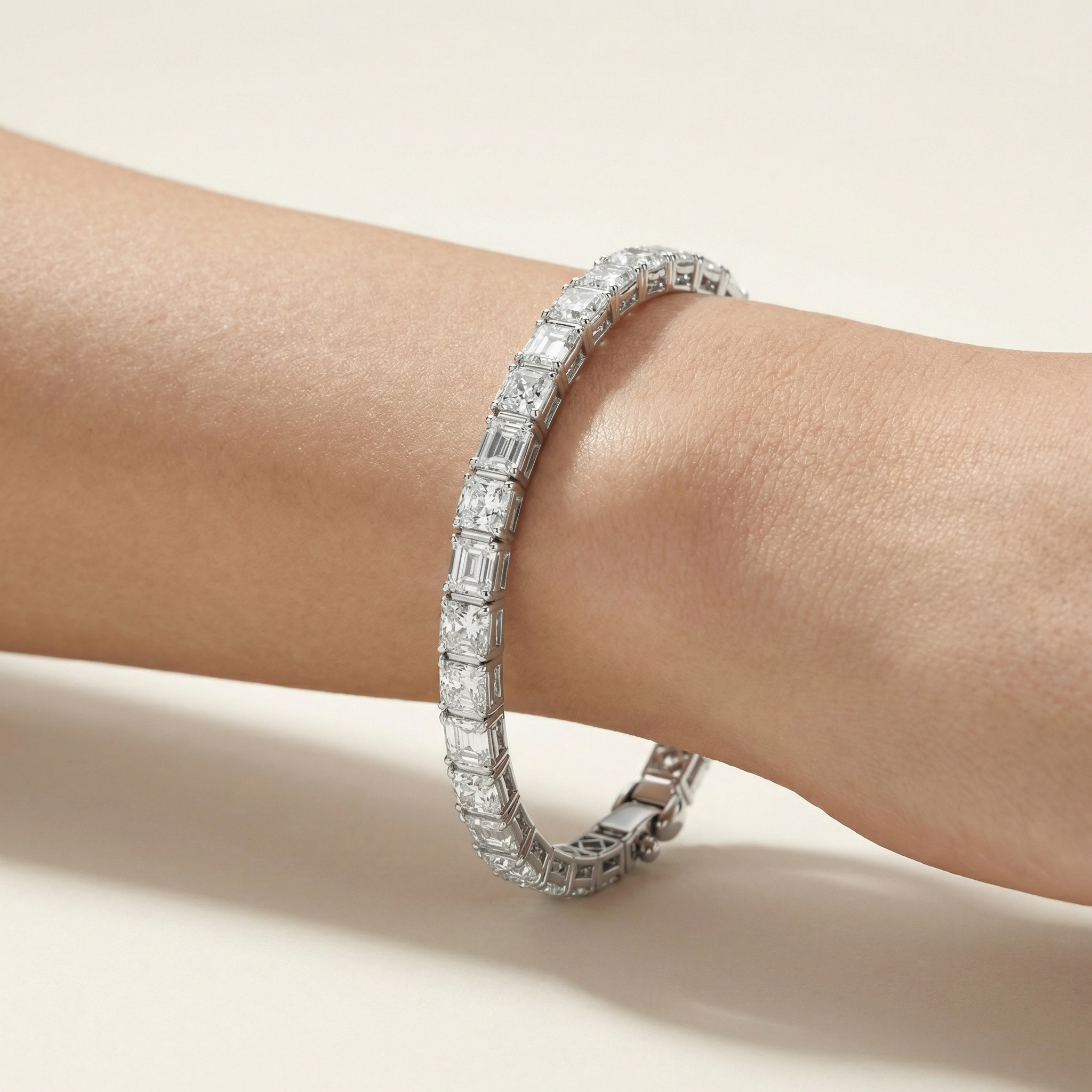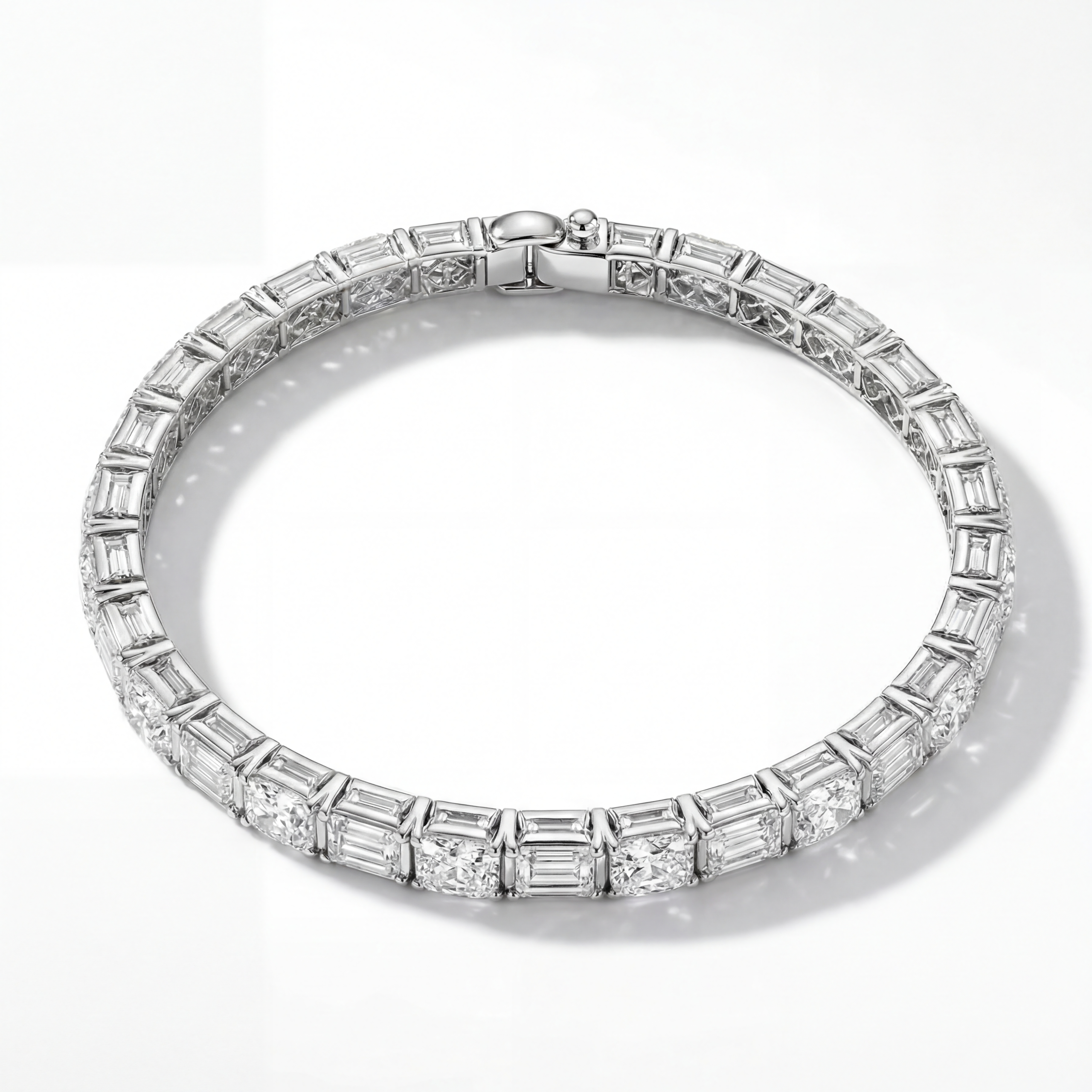 Each lab-grown diamond is selected for exceptional clarity and balanced proportions, forming a continuous line of structured brilliance around the wrist. The interplay between elongated emerald cuts and softly contoured cushion stones introduces contrast while preserving harmony.