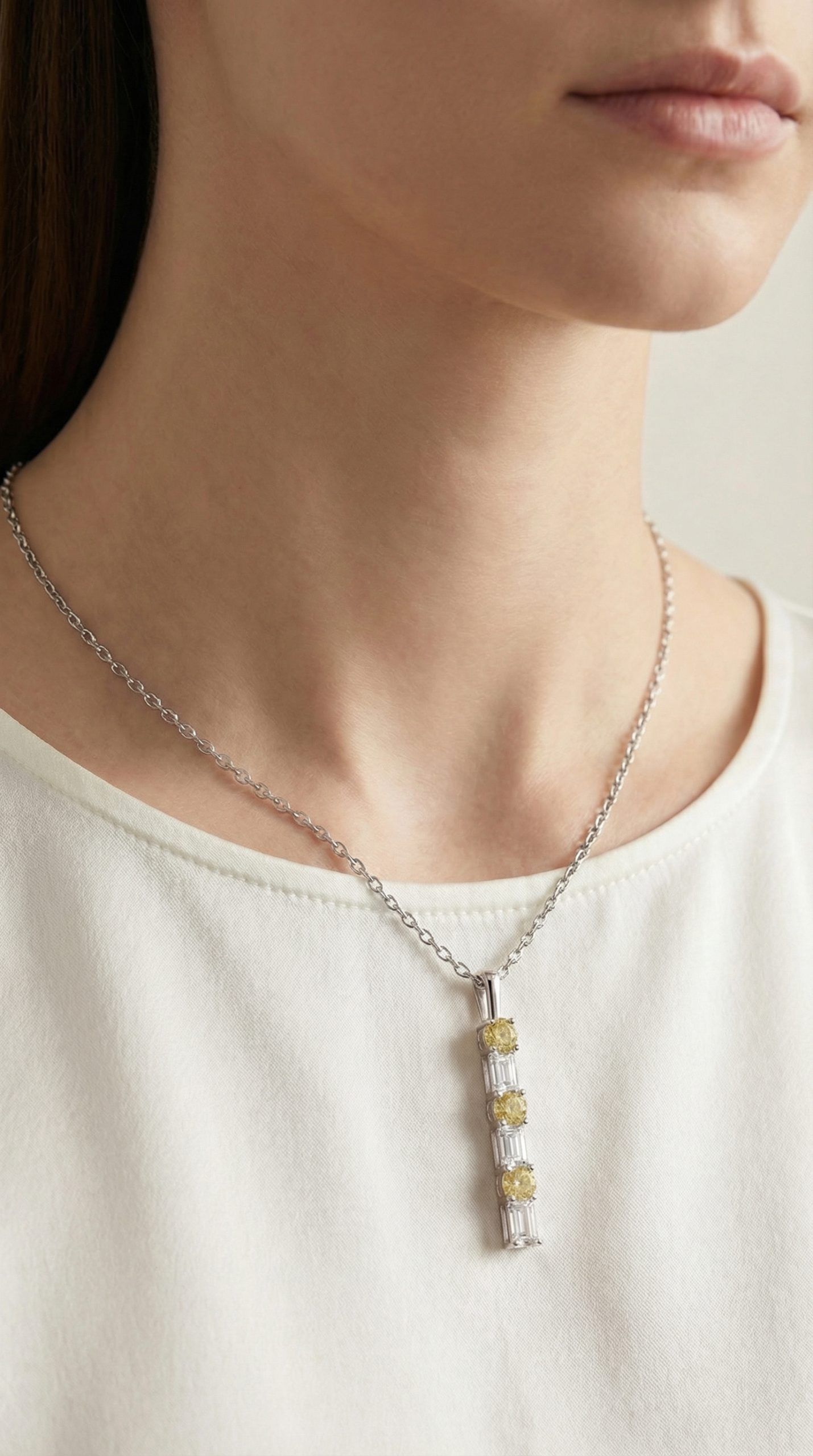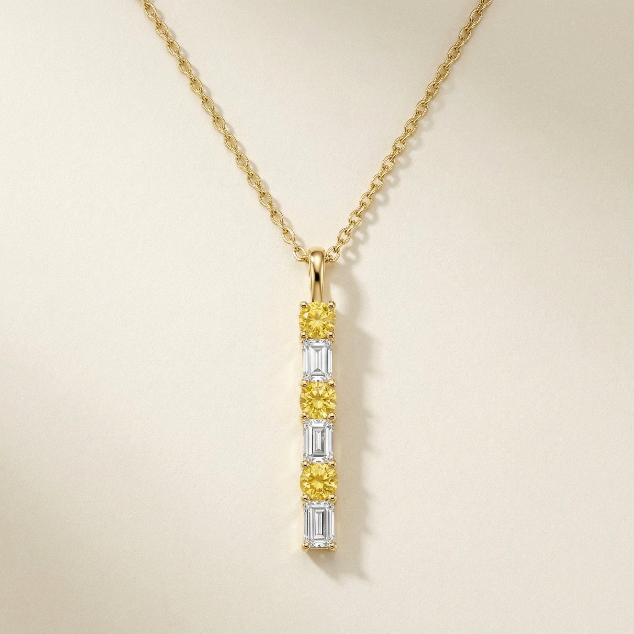 The design follows a disciplined vertical composition, alternating between natural white cushion-cut diamonds and fancy yellow emerald-cut diamonds. The structured layout creates a refined contrast between brilliance and saturation, balancing softness and architectural precision.