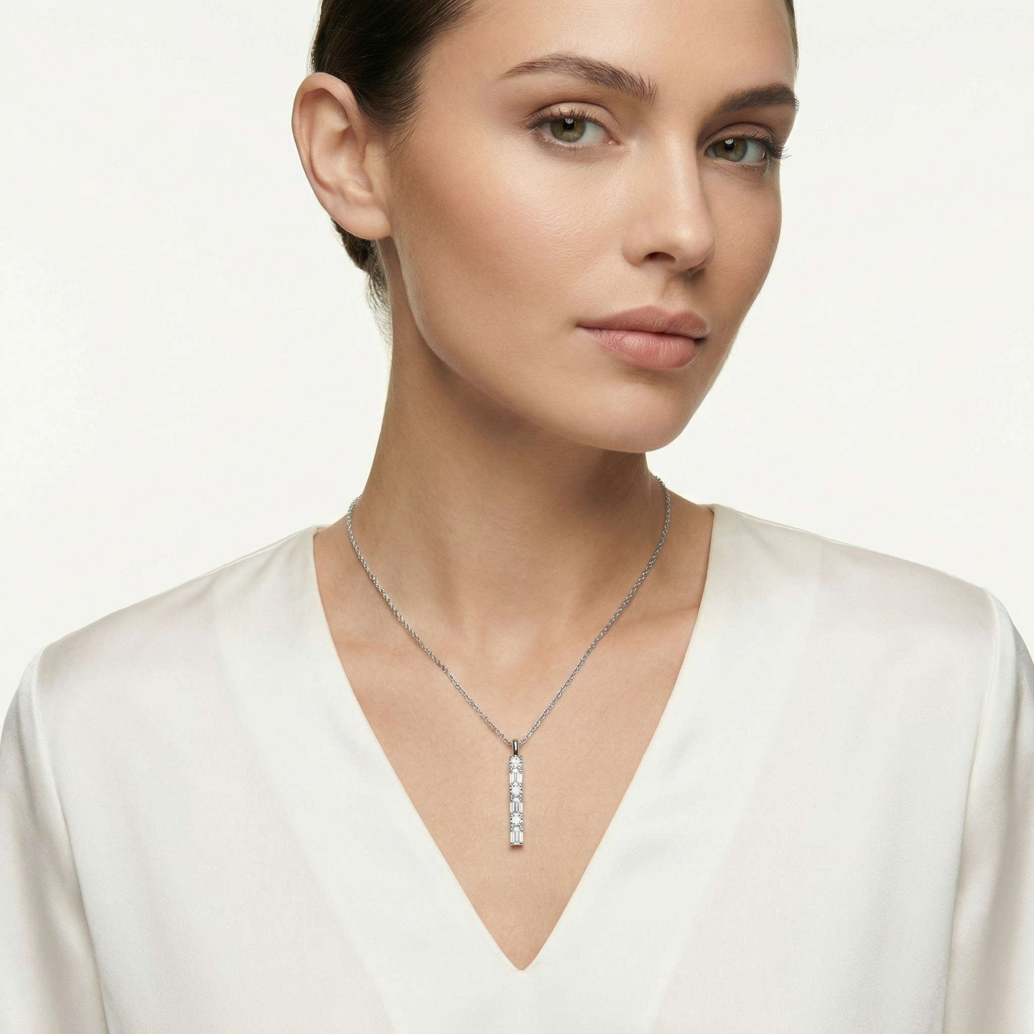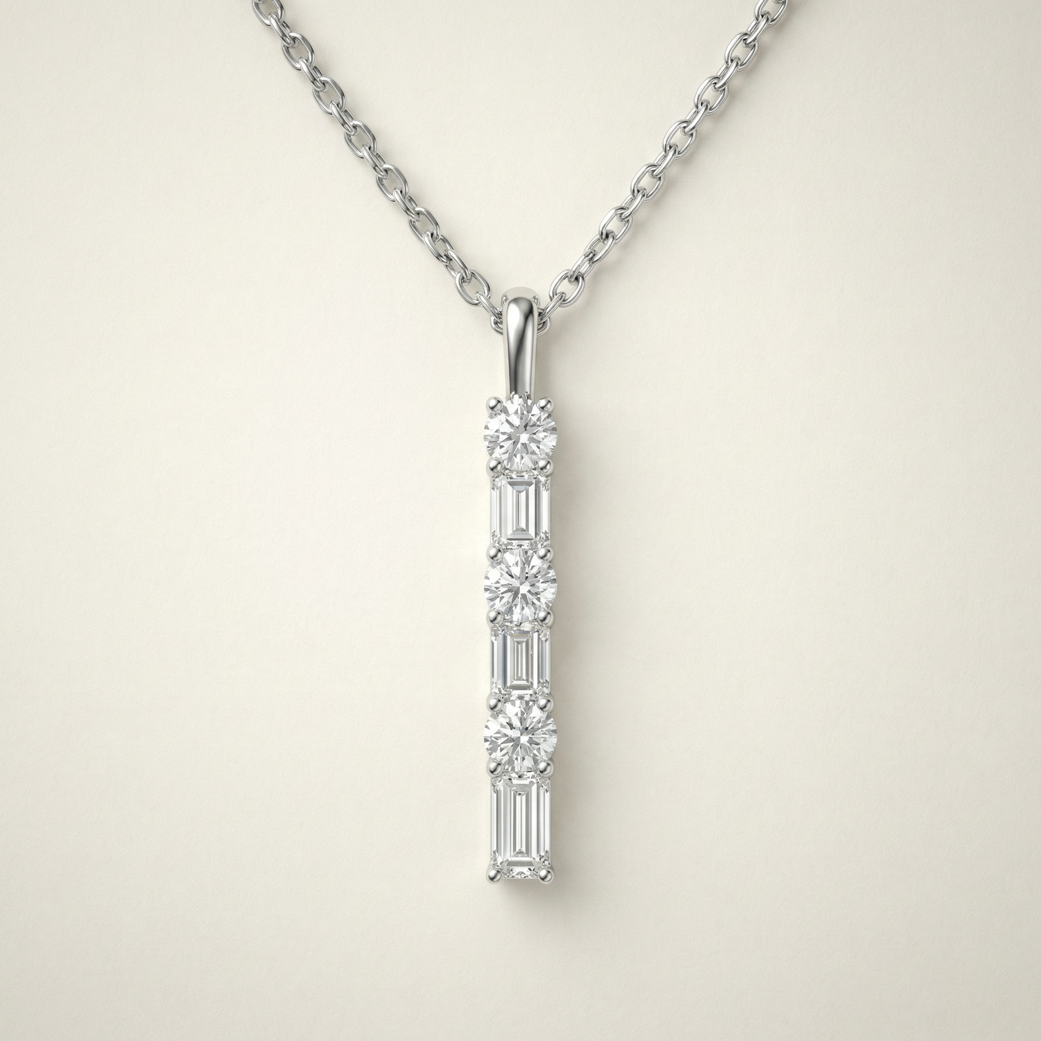 Crafted exclusively in 18K white gold, the design follows a clean vertical composition, combining structured geometry with controlled brilliance. The arrangement alternates between cushion-cut and emerald-cut laboratory-grown diamonds, creating a refined rhythm of soft curves and architectural lines.