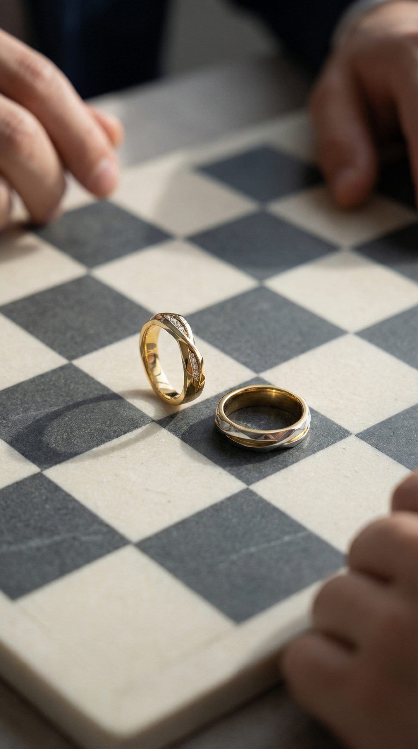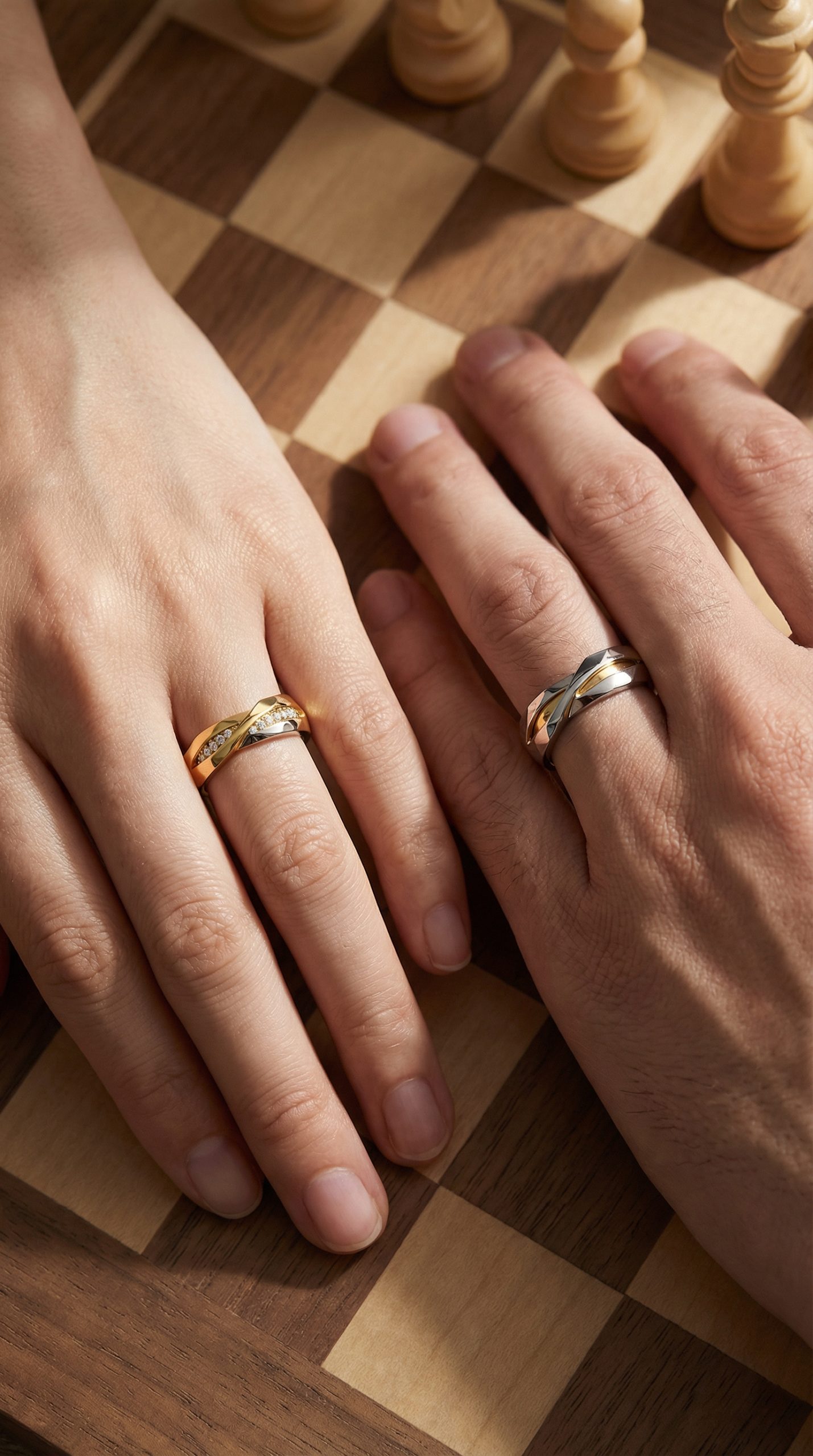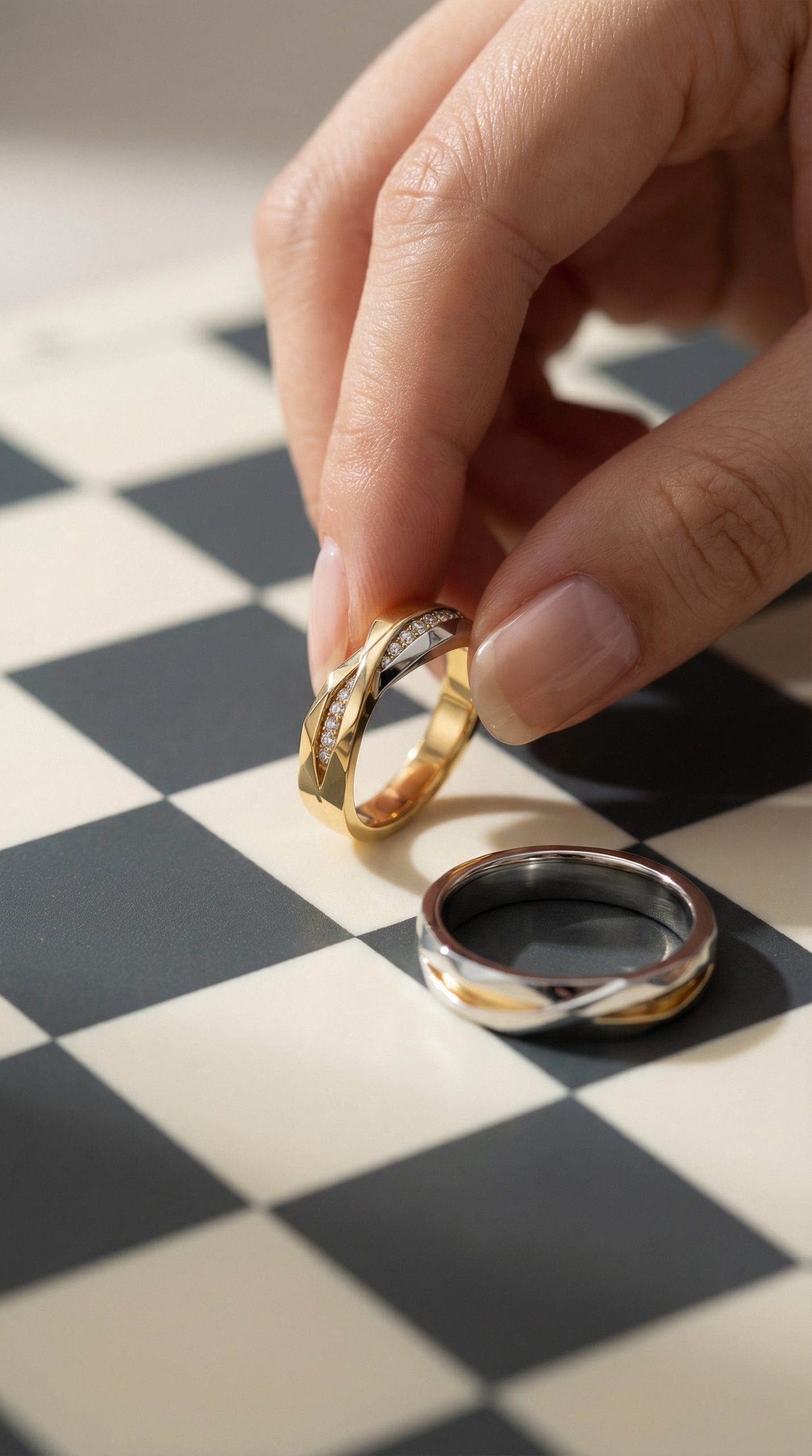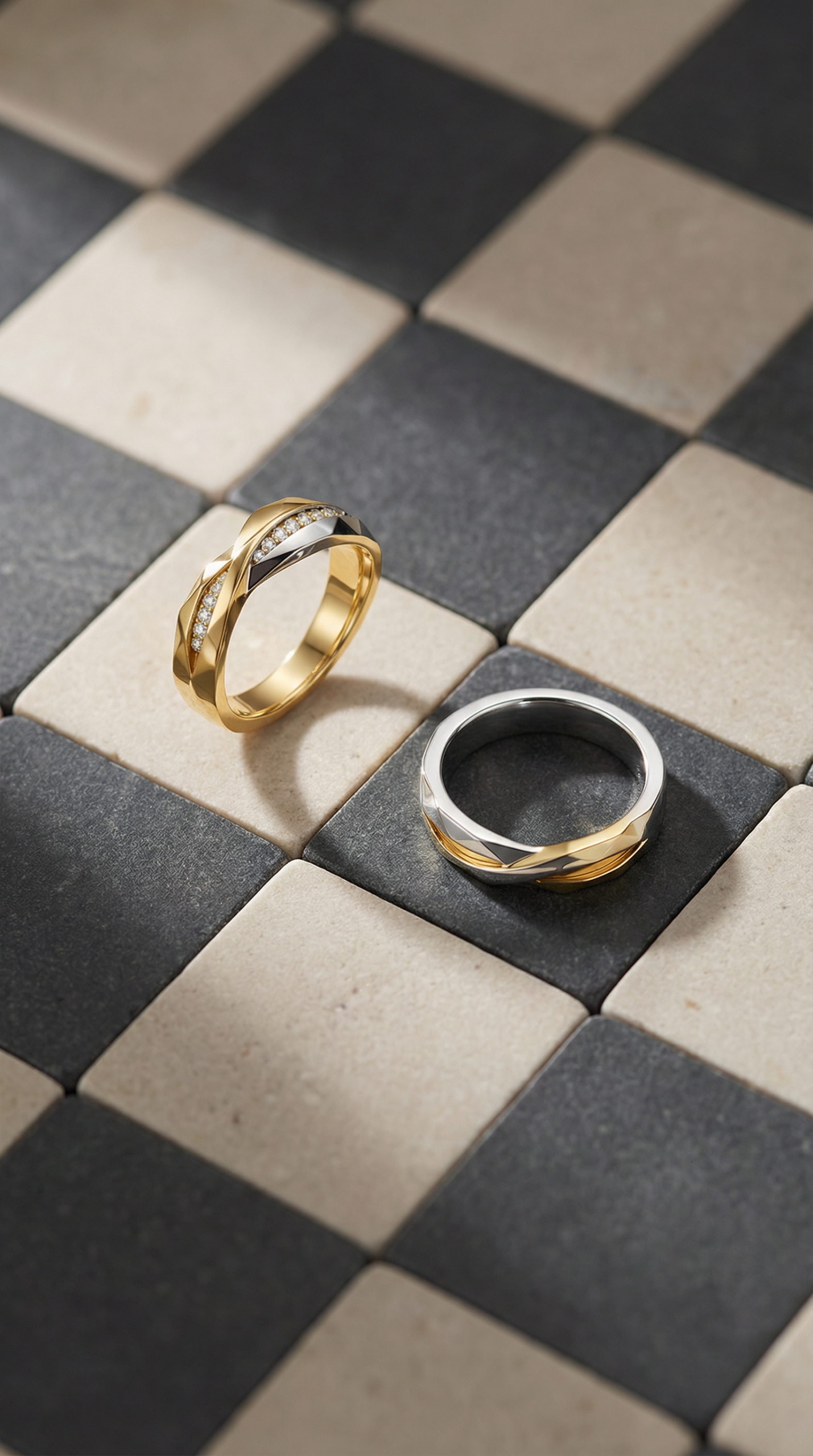 Designed as a complementary pair, the rings reflect balance through contrast — structured facets, sculptural lines, and refined surface finishes. The interplay of polished and angular elements creates depth while maintaining a disciplined, timeless silhouette.